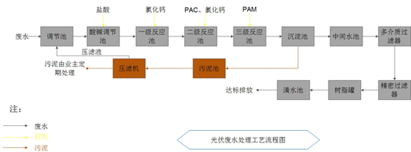 光伏废水的主要污染因子:氟离子、COD以及pH值。废水中的氟离子主要来自于生产工序中使用的氢氟酸,废水中的有机污染成份主要来自于制绒槽使用的异丙醇、丙酮(排放频率极少),而酸碱pH值污染因子主要是生产中使用的氢氟酸、盐酸、硝酸以及氢氧化钠等。