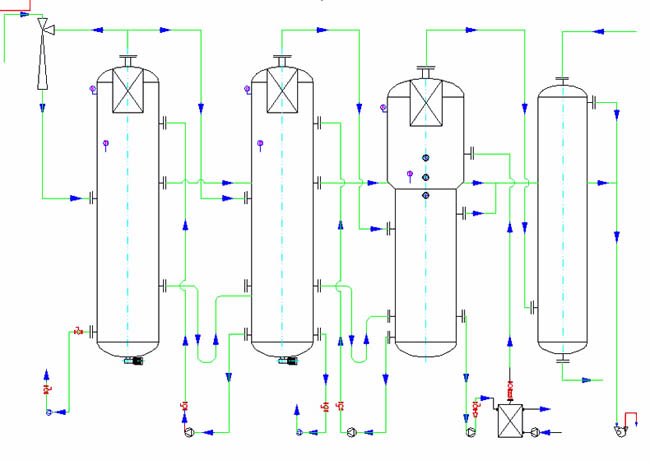 多效蒸发器传热系数高、蒸发温度低、料液受热温和、物料受热时间短,适合蒸发热敏性、粘滞性、发泡性、易结垢的物料。实际应用中可设计成多款双效、三效、四效蒸发器,形式分为自然循环、强制循环、降膜蒸发、组合蒸发,流程可分为顺流、逆流、混流等。综合考虑能耗和设备投资,达到投资经济、运行可靠,符合环保要求。