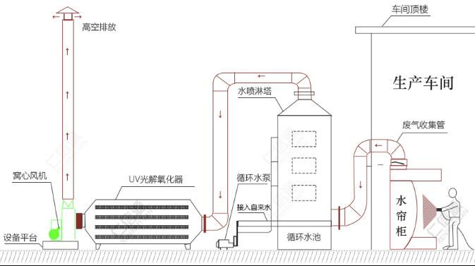 当废气进入到UV光氧催化器内部时,需通过较长的通过时间,需1.5S,经过紫外线的照射,使废气分子分解,发生化学反应,物质在紫外线照射下吸收光线当中携带的能量成激发态,从而发生—系列光化学反应,最终变成无害的低分子化合物,实现低污染排放。