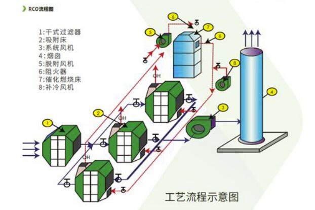 VOCs废气通入活性炭吸附塔内部,与活性炭表面接触,废气污染分子被活性炭表面吸附净化,活性炭再被脱附后转换成小风量、高浓度的有机废气被送往催化燃烧设备进行氧化,在200度左右的高温下,有机物被氧化分解成二氧化碳、水等无害气体。燃烧后的热废气通过热交换器加热冷空气,热交换后降温的气体部分排放,部分用于活性炭的脱附再生,达到废热利用和节能的目的。
